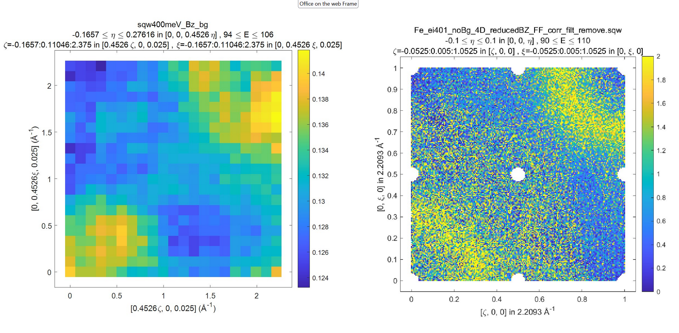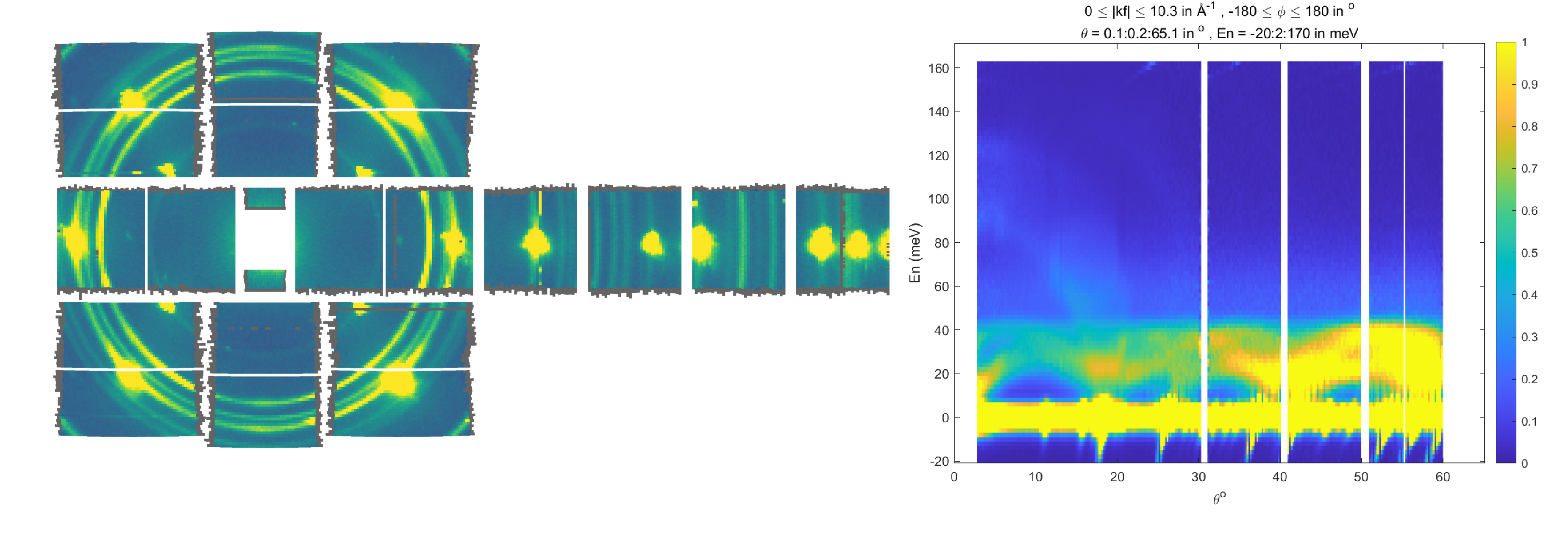 Left part of the image represents Mantid instrument view image. It is obvious that there is small beam leakage around beam stop window and strong powder lines around Bragg peaks. This is the background which one wants to remove. Right part of this image represents 2-dimensional image obtained from instrument_view_cut and we want to extract this image from whole sqw file containing magnetic signals.