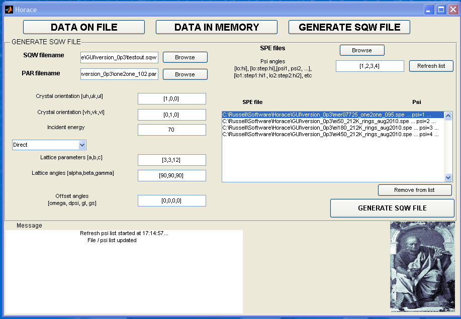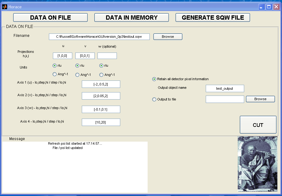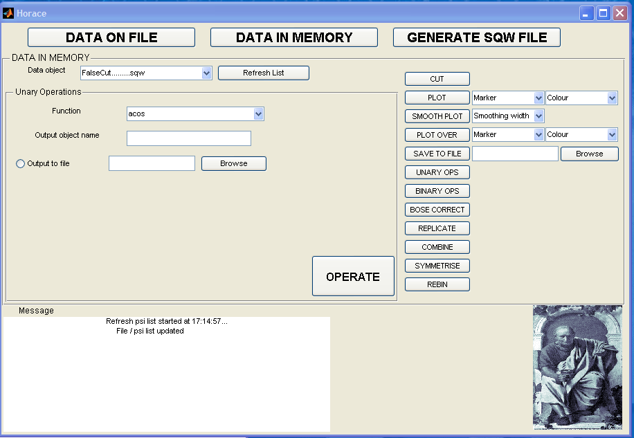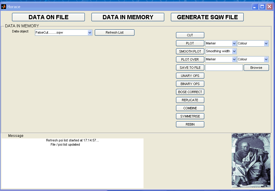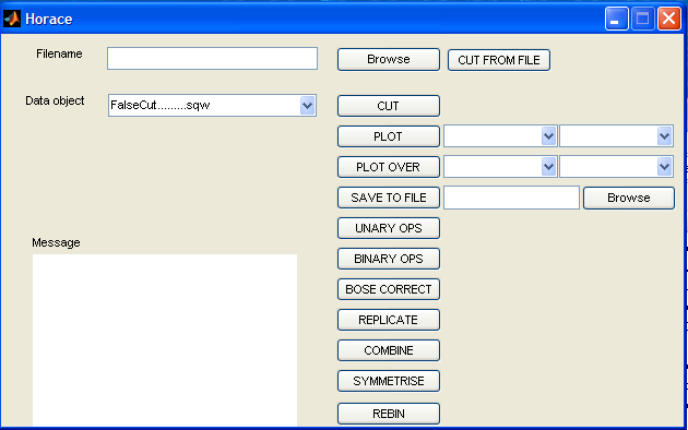The Horace Graphical User Interface (GUI) is available as an alternative to using the command line. It is included in the latest distributions of Horace and we welcome comments from users regarding how it could be improved (please email Horace Help with feedback).