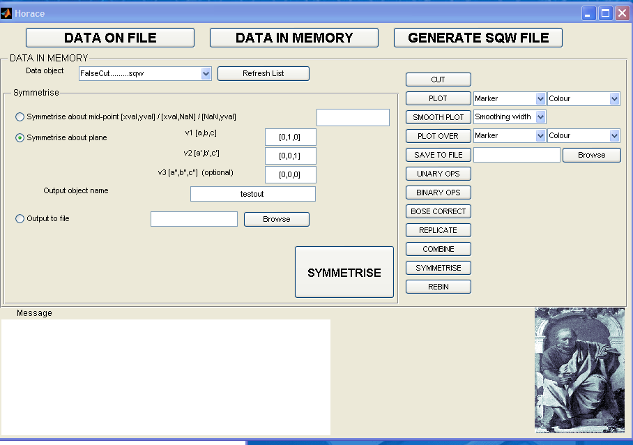 Within this tab there are multiple tabs which you can toggle between to run the various operations in Horace, such as plotting, taking cuts from cuts, symmetrising, binary operations, etc, etc.